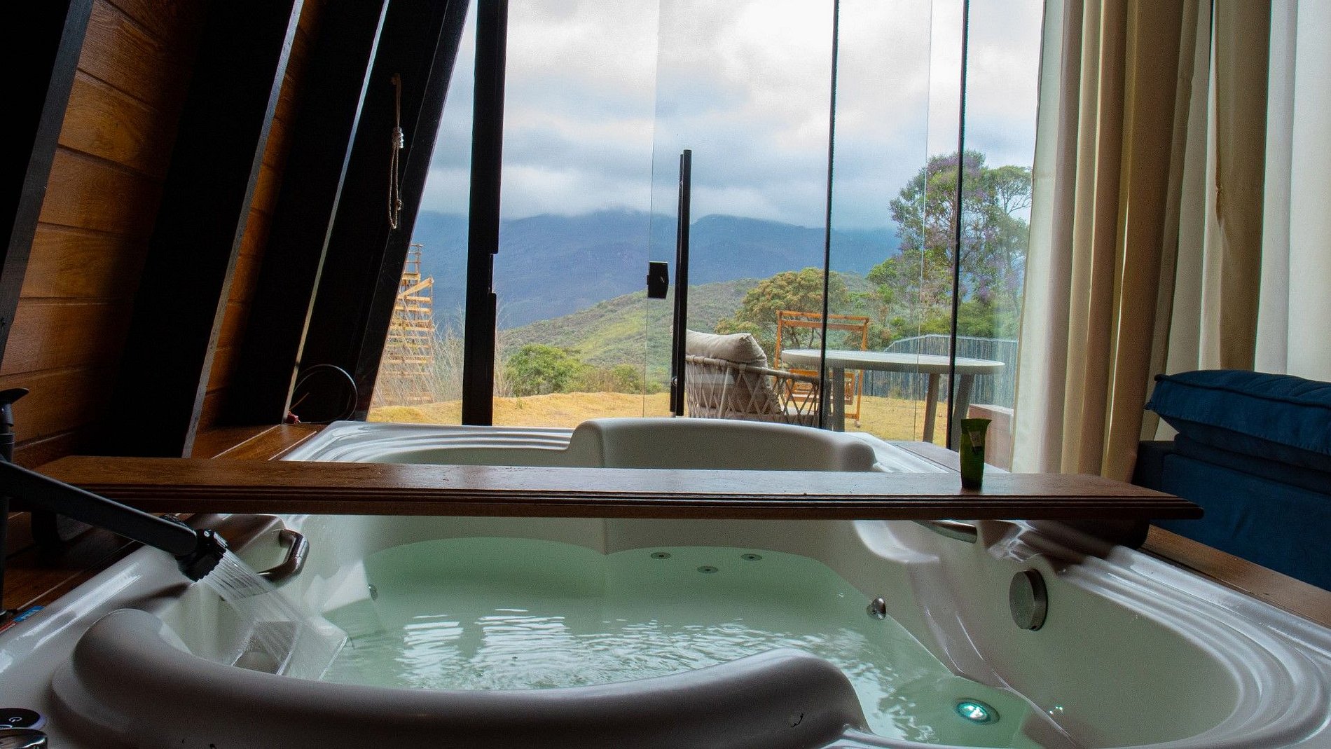 Chalé de luxo privativo com vista para as montanhas, banheira de imersão, chuveiro duplo, cozinha completa,