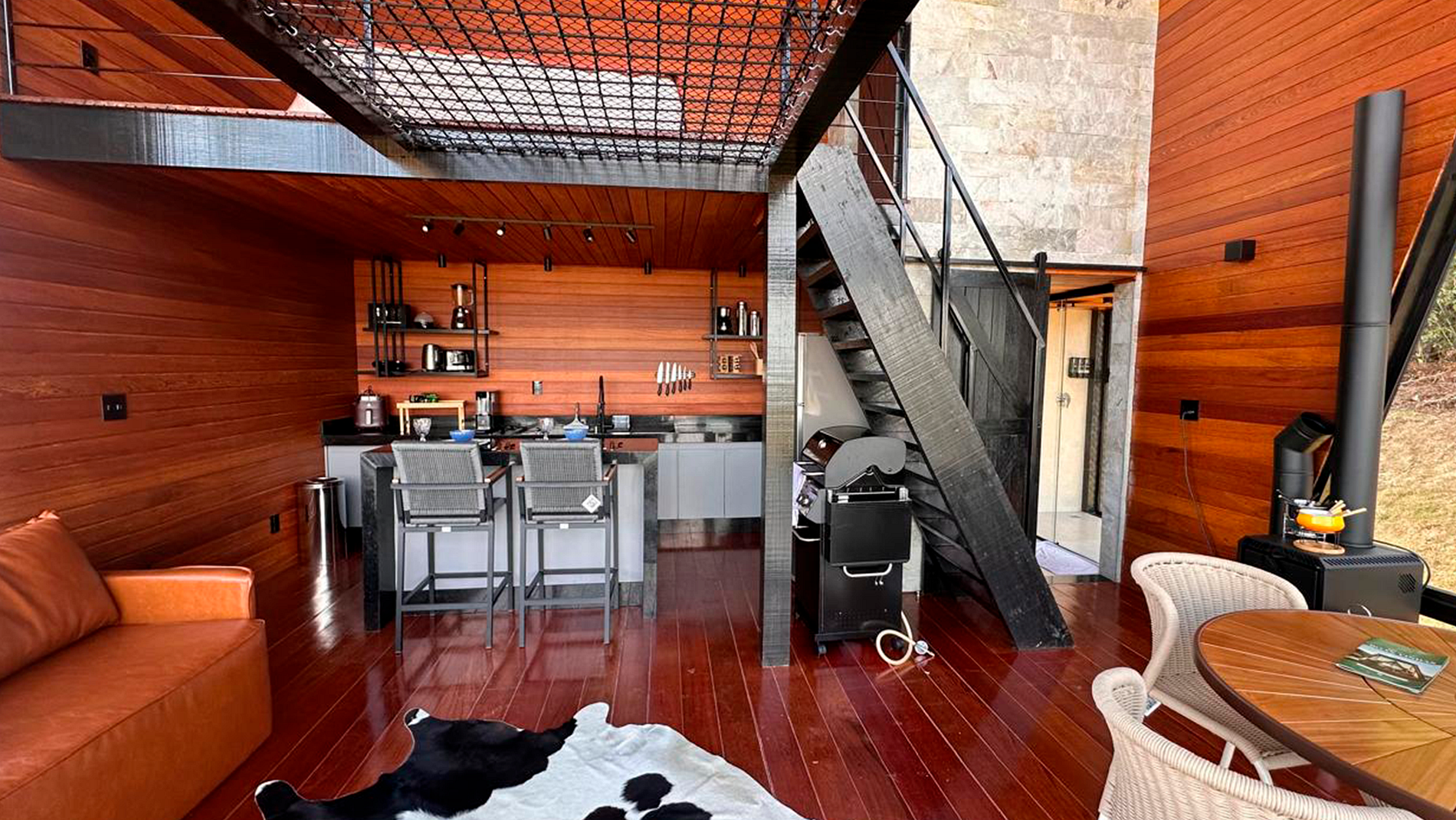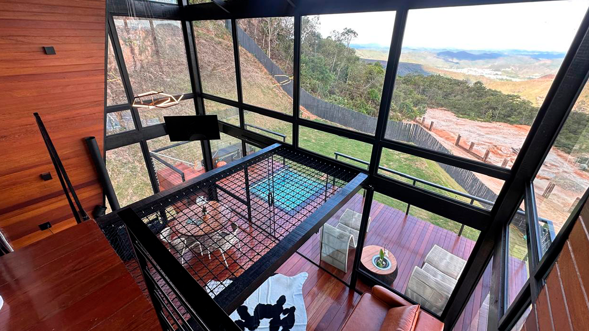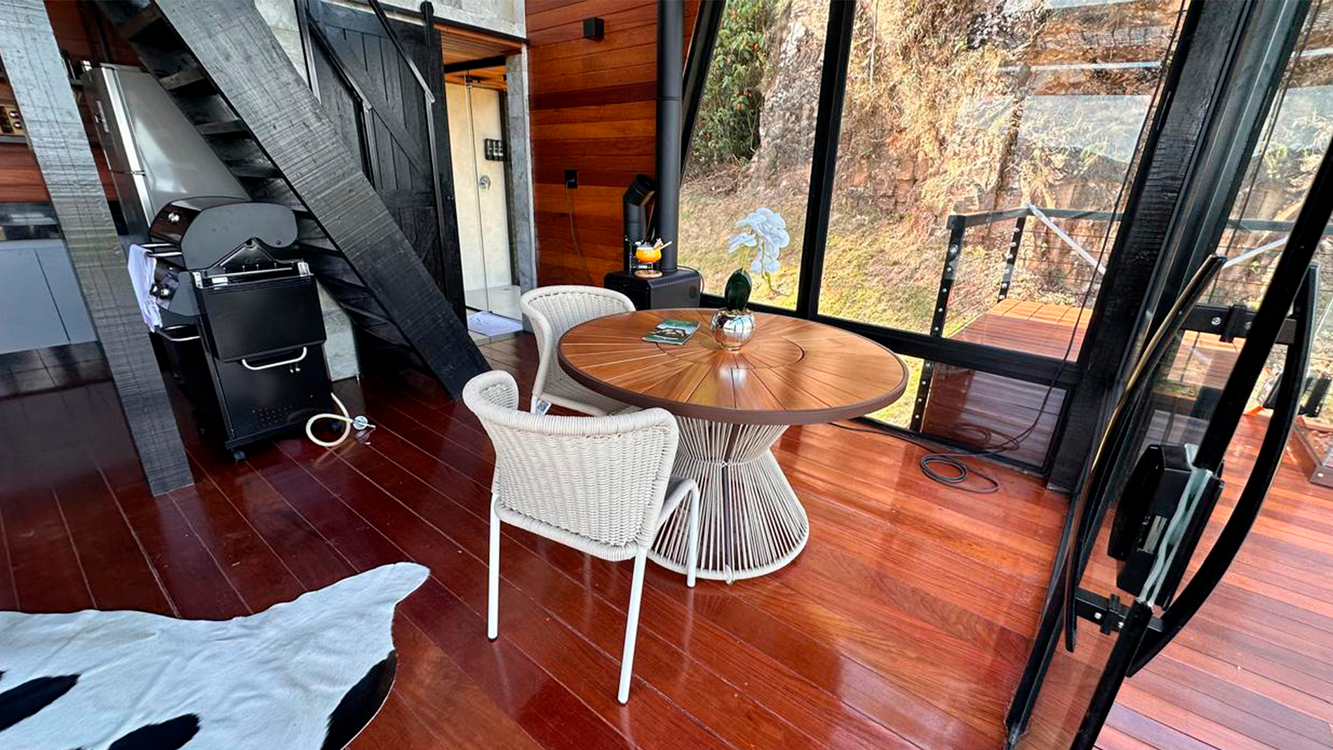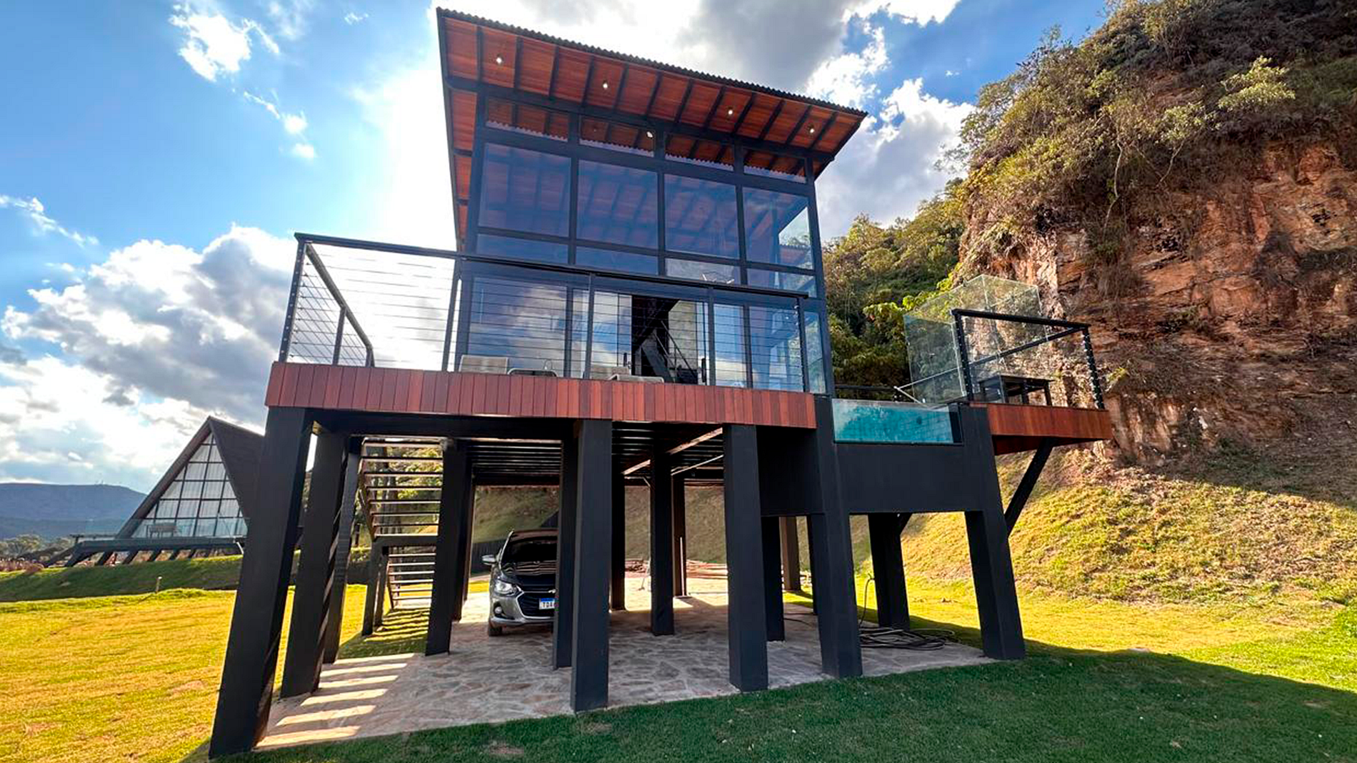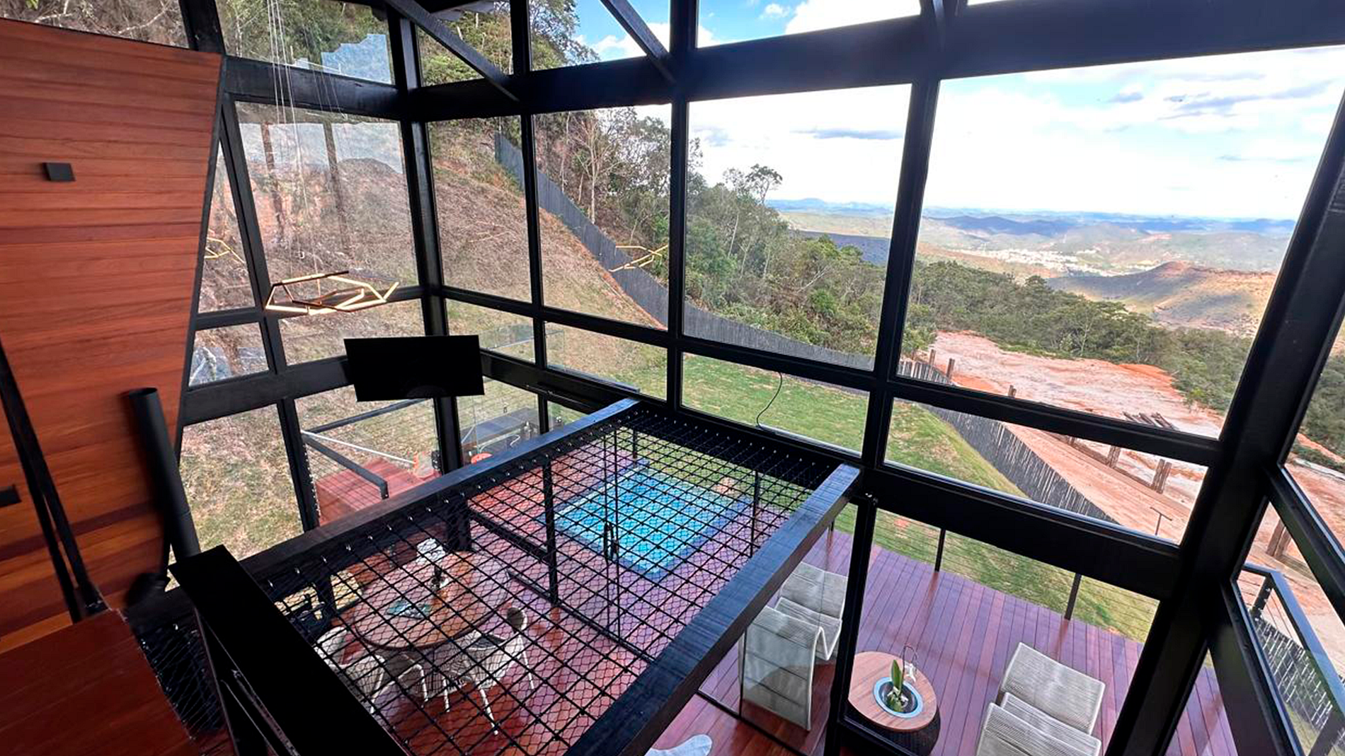 - Arquitetura icônica: formato triangular em “A”, com telhado inclinado que cria um ambiente acolhedor e ao mesmo tempo imponente. - Integração com a paisagem: grandes janelas de vidro permitem ampla entrada de luz natural e vistas panorâmicas das montanhas e da vegetação da Serra do Espinhaço. - Ambiente interno: - Sala de estar com pé-direito alto, trazendo sensação de amplitude. - Decoração minimalista e elegante, com madeira aparente e detalhes rústicos. - Espaço aberto que conecta sala, cozinha e área de convivência. - Conforto: equipado com lareira, móveis aconchegantes e iluminação suave para criar atmosfera intimista. - Área externa: deck de madeira com vista privilegiada, ideal para contemplar o pôr do sol ou apreciar o céu estrelado.