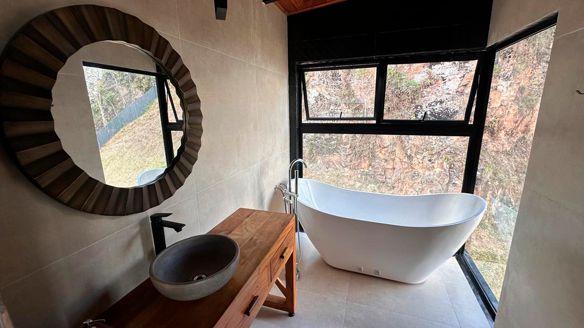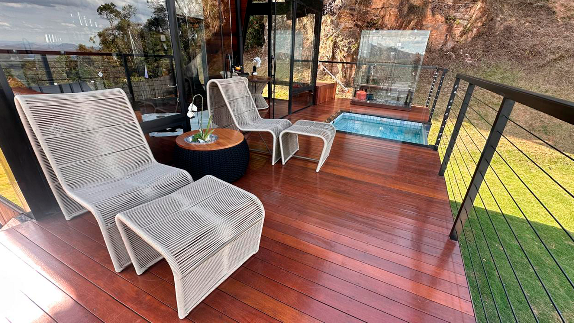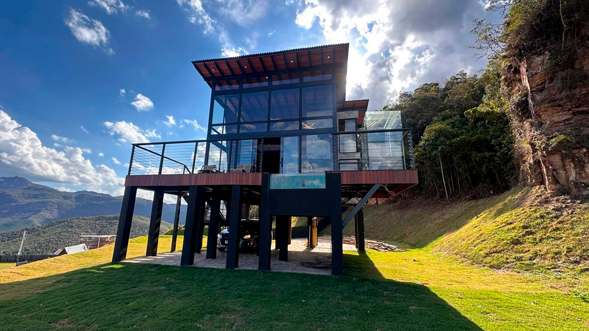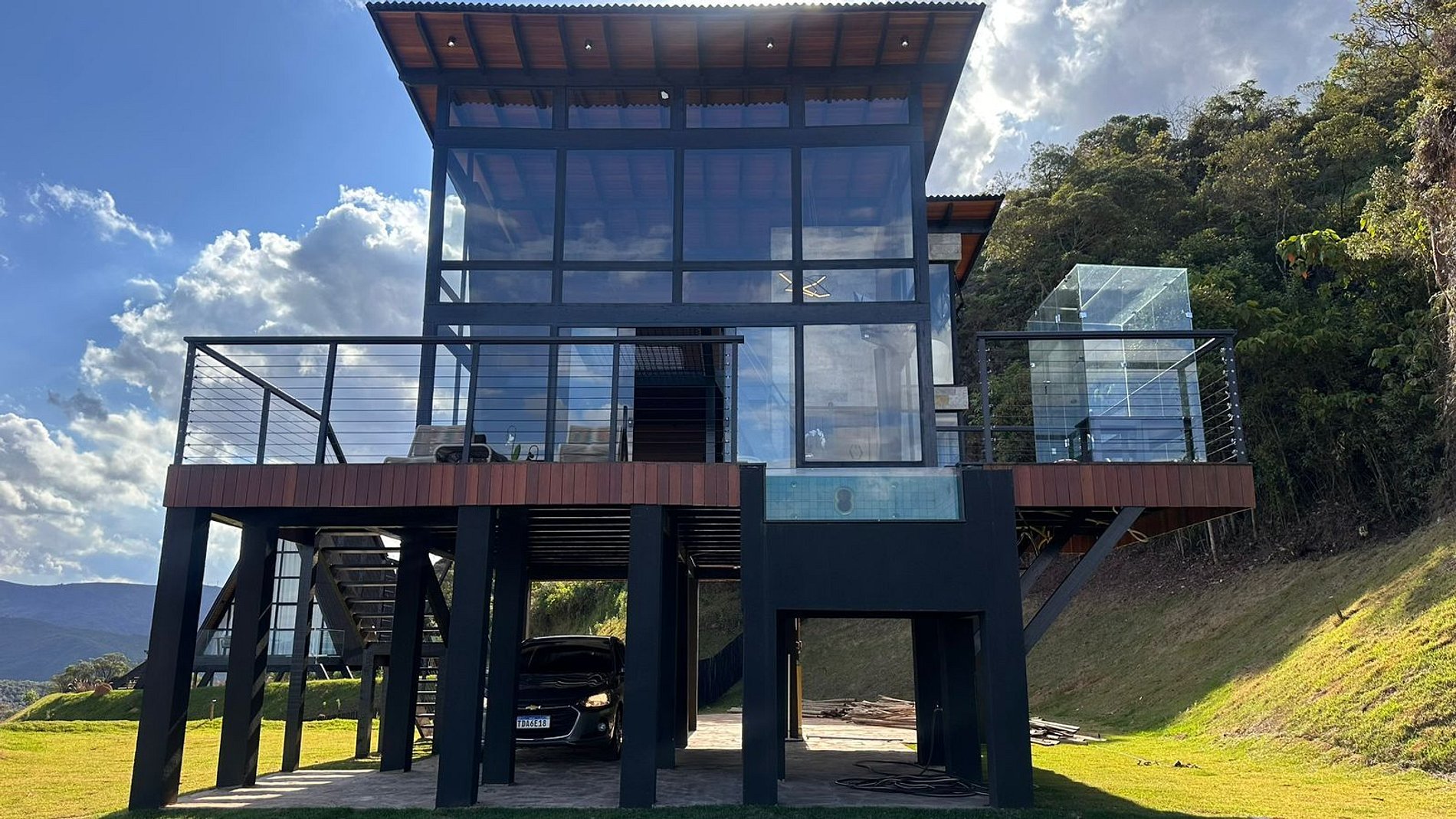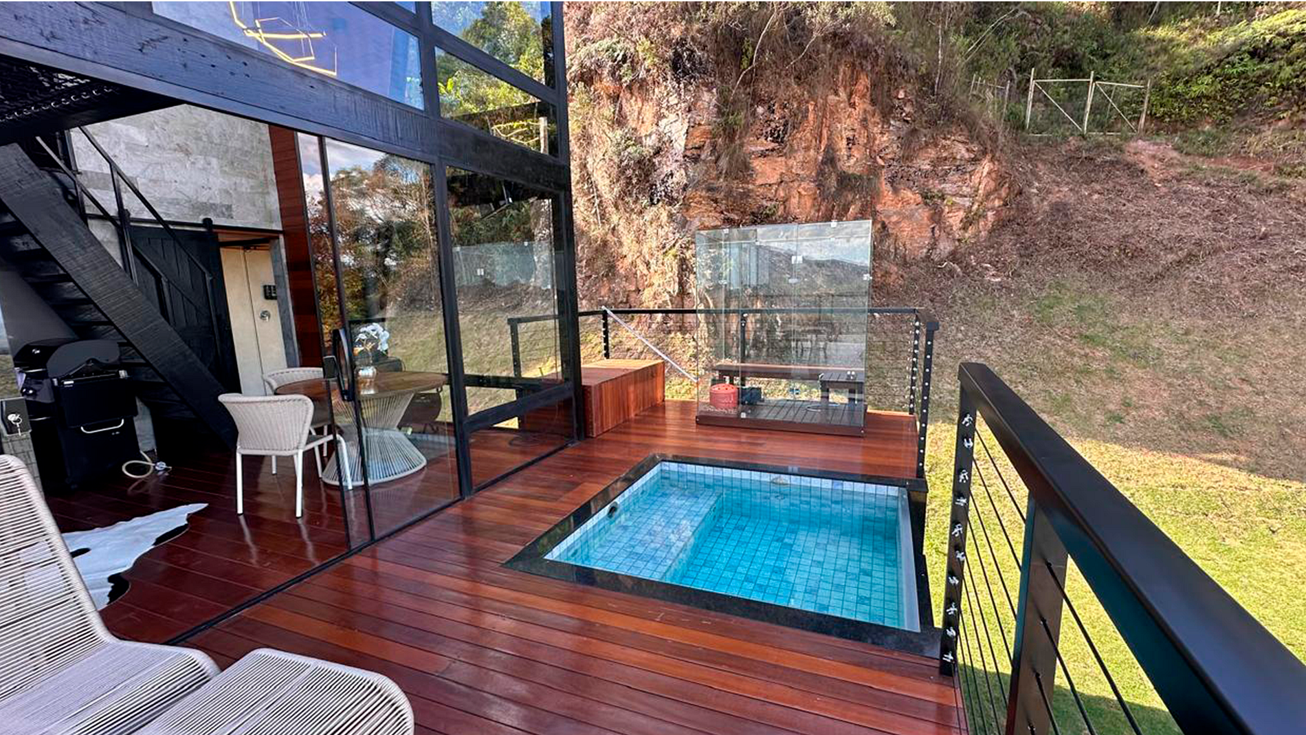 - Arquitetura icônica: formato triangular em “A”, com telhado inclinado que cria um ambiente acolhedor e ao mesmo tempo imponente. - Integração com a paisagem: grandes janelas de vidro permitem ampla entrada de luz natural e vistas panorâmicas das montanhas e da vegetação da Serra do Espinhaço. - Ambiente interno: - Sala de estar com pé-direito alto, trazendo sensação de amplitude. - Decoração minimalista e elegante, com madeira aparente e detalhes rústicos. - Espaço aberto que conecta sala, cozinha e área de convivência. - Conforto: equipado com lareira, móveis aconchegantes e iluminação suave para criar atmosfera intimista. - Área externa: deck de madeira com vista privilegiada, ideal para contemplar o pôr do sol ou apreciar o céu estrelado.