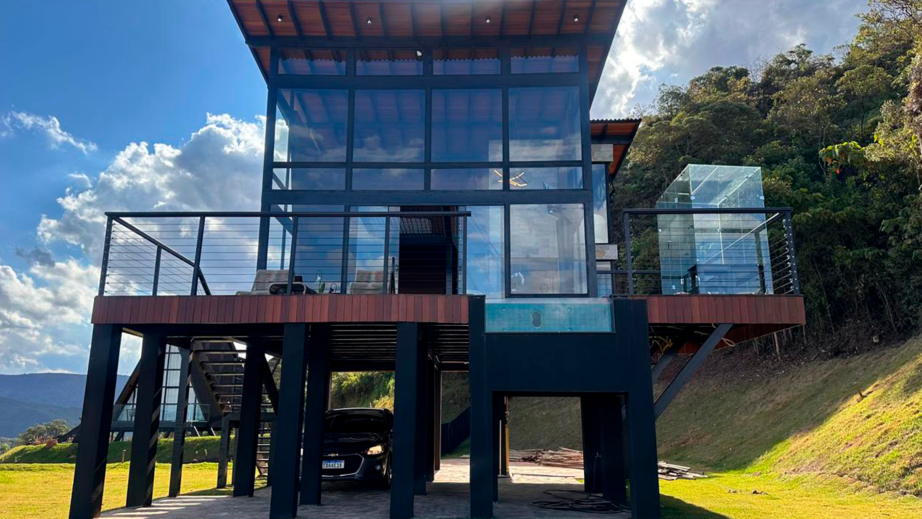 Como todos nossos Chales e Cabanas, toda estrutura em madeira e fechamento em vidro esse tem quase 50% em vidro dando assim uma vista geral da paisagem local, gerando aconchego e integração com a natureza e sensação de bem estar.