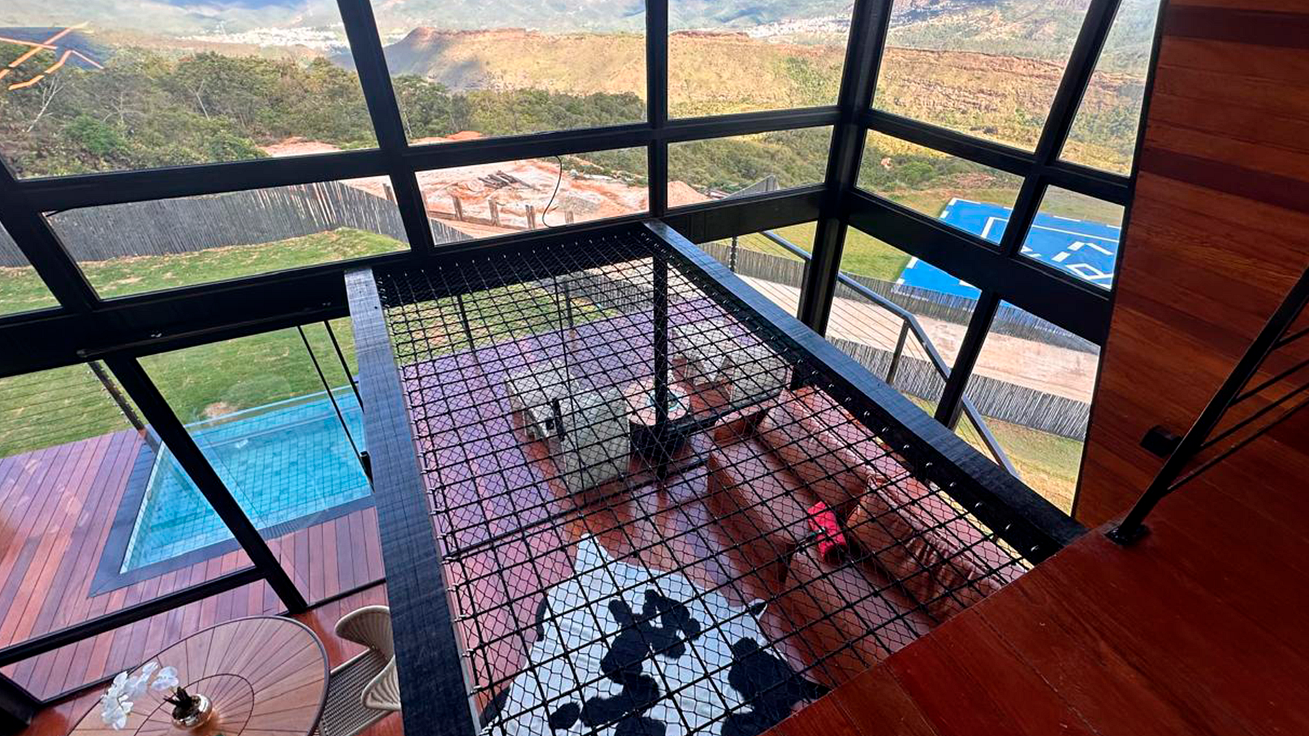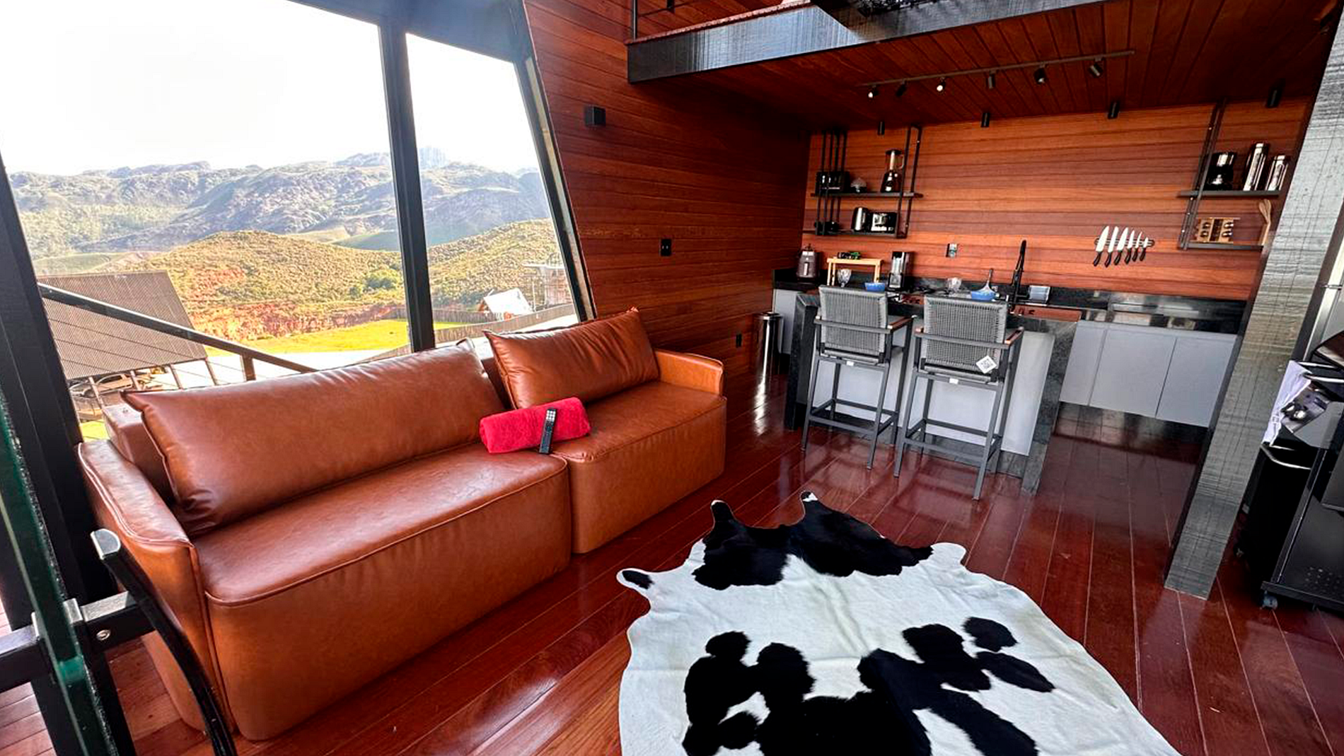 - Arquitetura icônica: formato triangular em “A”, com telhado inclinado que cria um ambiente acolhedor e ao mesmo tempo imponente. - Integração com a paisagem: grandes janelas de vidro permitem ampla entrada de luz natural e vistas panorâmicas das montanhas e da vegetação da Serra do Espinhaço. - Ambiente interno: - Sala de estar com pé-direito alto, trazendo sensação de amplitude. - Decoração minimalista e elegante, com madeira aparente e detalhes rústicos. - Espaço aberto que conecta sala, cozinha e área de convivência. - Conforto: equipado com lareira, móveis aconchegantes e iluminação suave para criar atmosfera intimista. - Área externa: deck de madeira com vista privilegiada, ideal para contemplar o pôr do sol ou apreciar o céu estrelado.
