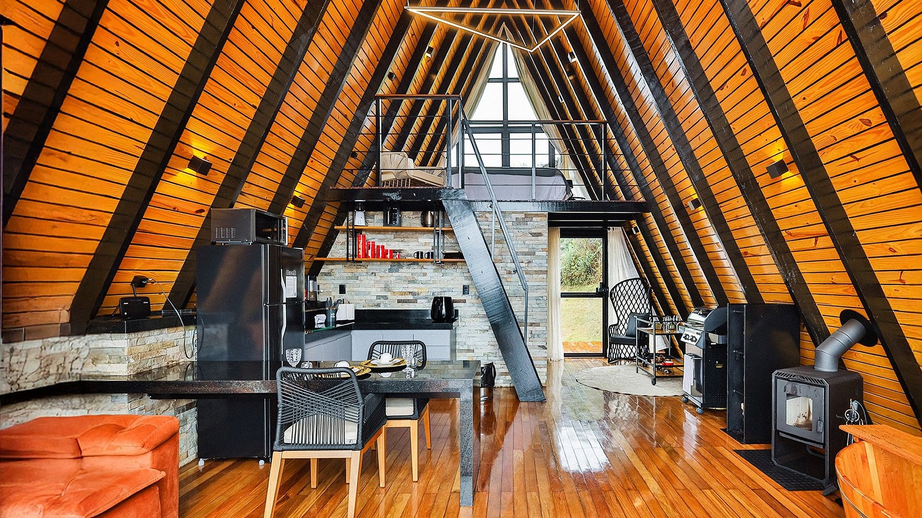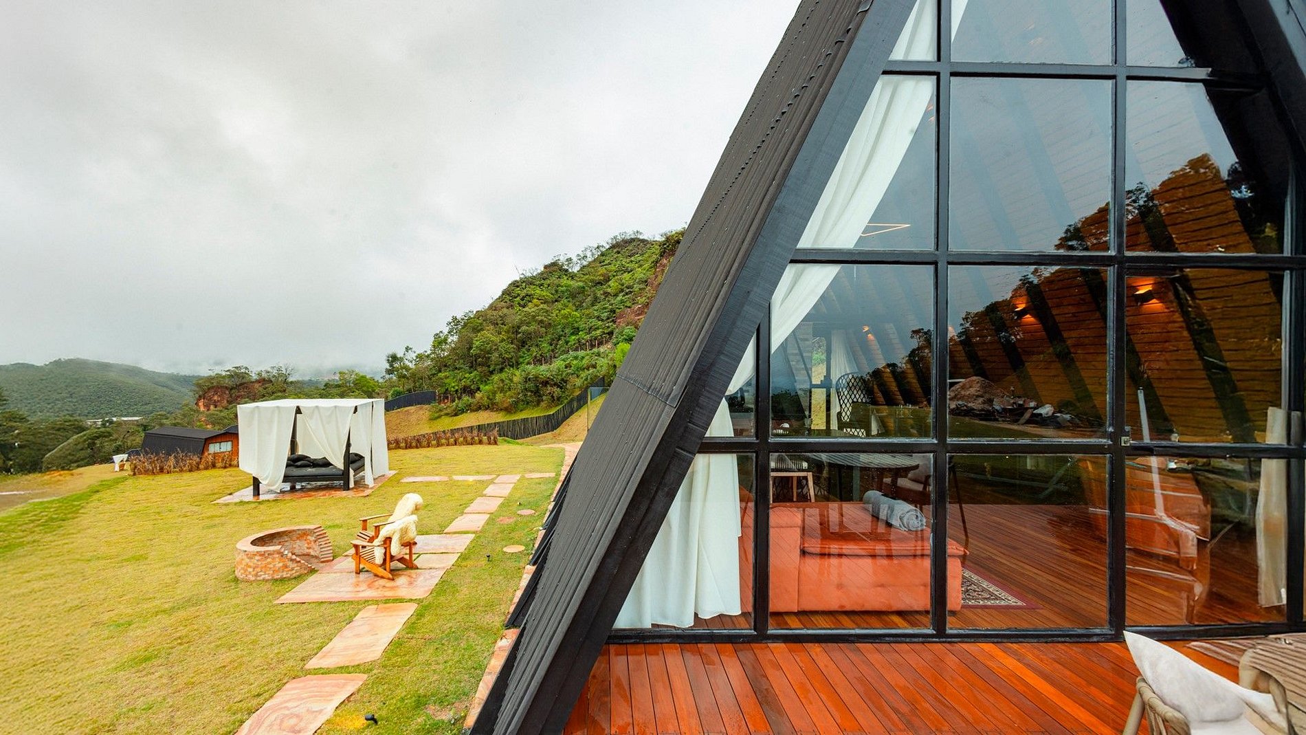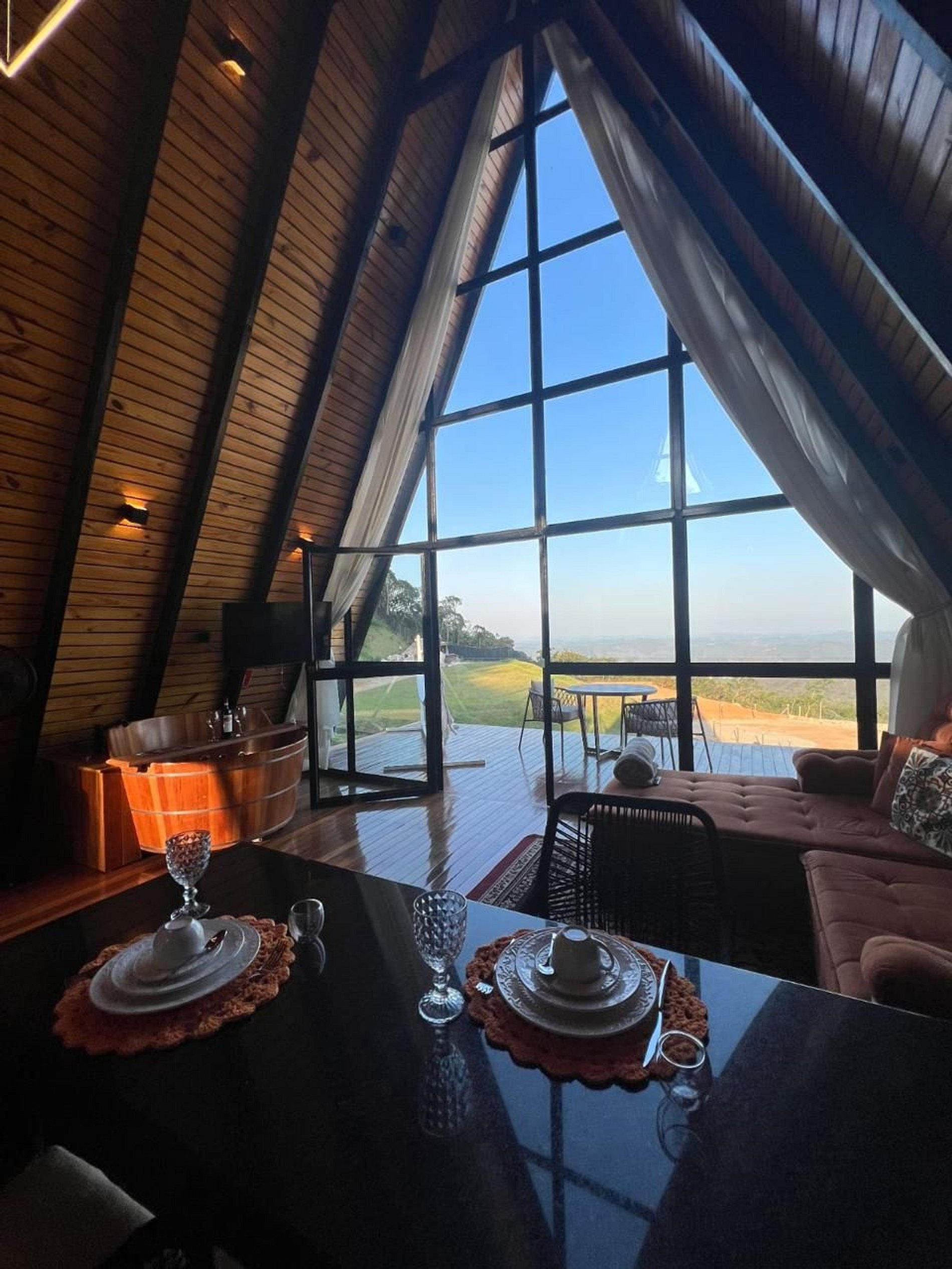 - Arquitetura icônica: formato triangular em “A”, com telhado inclinado que cria um ambiente acolhedor e ao mesmo tempo imponente. - Integração com a paisagem: grandes janelas de vidro permitem ampla entrada de luz natural e vistas panorâmicas das montanhas e da vegetação da Serra do Espinhaço. - Ambiente interno: - Sala de estar com pé-direito alto, trazendo sensação de amplitude. - Decoração minimalista e elegante, com madeira aparente e detalhes rústicos. - Espaço aberto que conecta sala, cozinha e área de convivência. - Conforto: equipado com lareira, móveis aconchegantes e iluminação suave para criar atmosfera intimista. - Área externa: deck de madeira com vista privilegiada, ideal para contemplar o pôr do sol ou apreciar o céu estrelado.