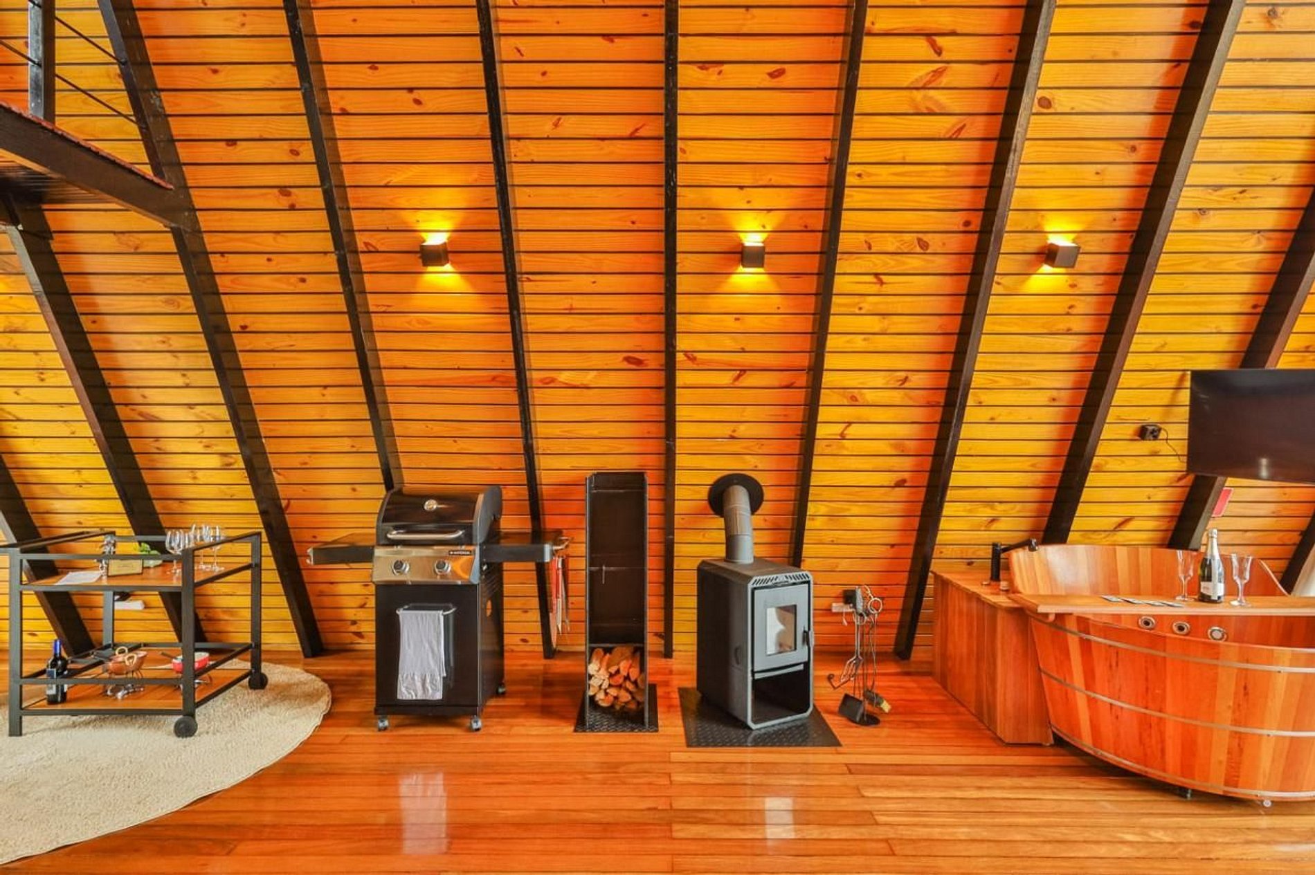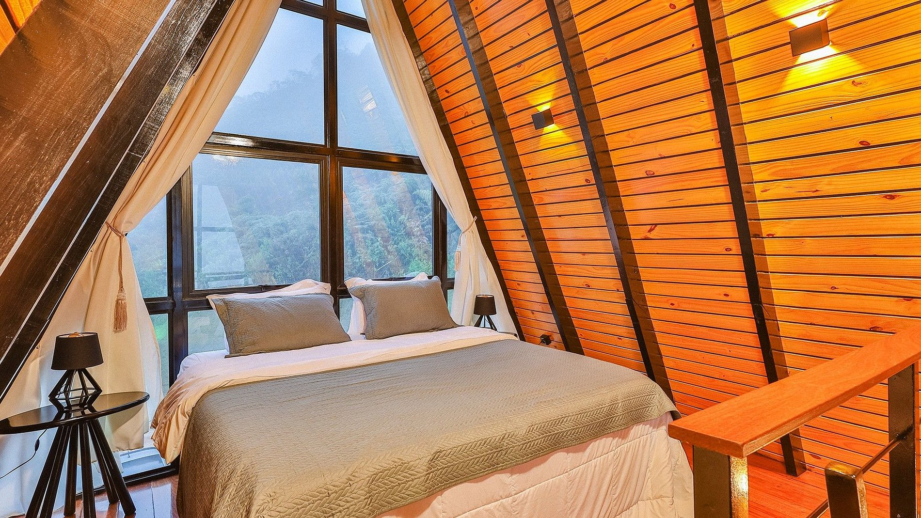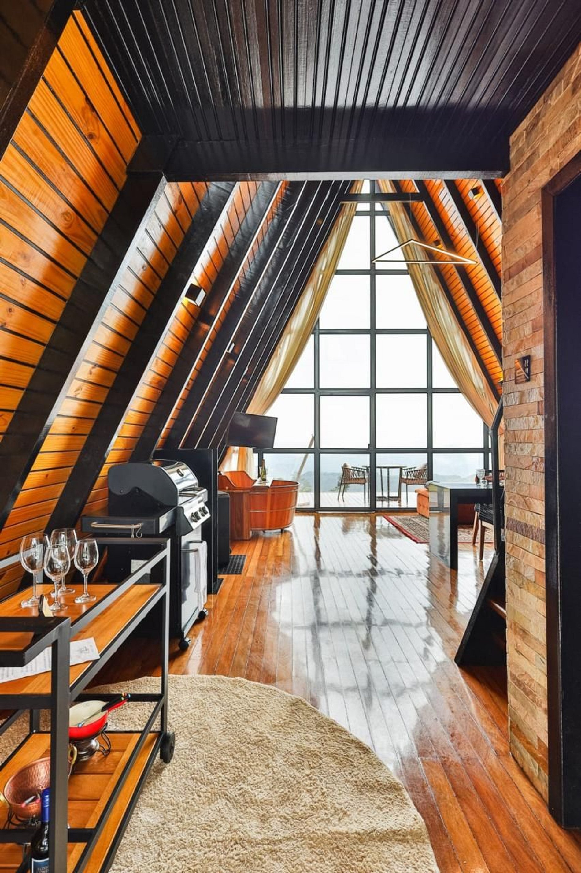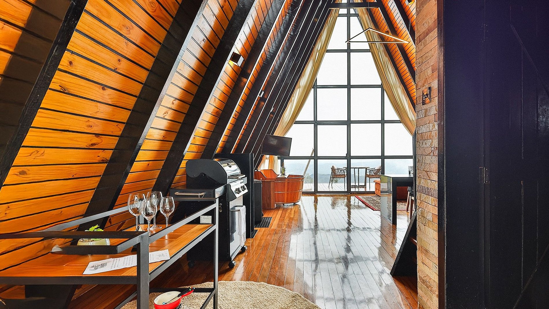- Arquitetura icônica: formato triangular em “A”, com telhado inclinado que cria um ambiente acolhedor e ao mesmo tempo imponente. - Integração com a paisagem: grandes janelas de vidro permitem ampla entrada de luz natural e vistas panorâmicas das montanhas e da vegetação da Serra do Espinhaço. - Ambiente interno: - Sala de estar com pé-direito alto, trazendo sensação de amplitude. - Decoração minimalista e elegante, com madeira aparente e detalhes rústicos. - Espaço aberto que conecta sala, cozinha e área de convivência. - Conforto: equipado com lareira, móveis aconchegantes e iluminação suave para criar atmosfera intimista. - Área externa: deck de madeira com vista privilegiada, ideal para contemplar o pôr do sol ou apreciar o céu estrelado.