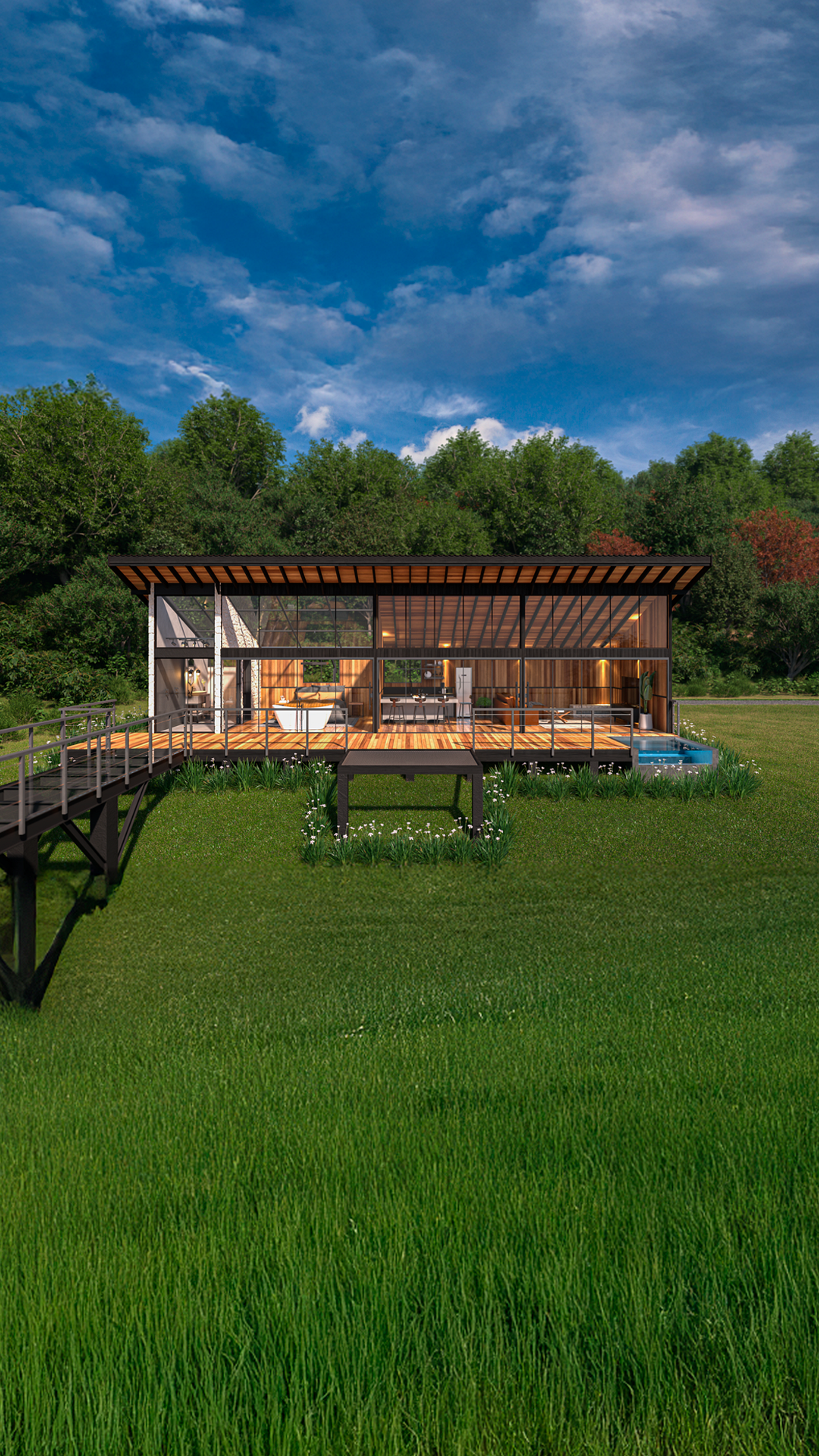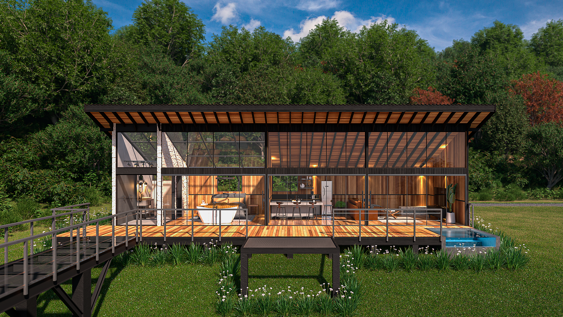 Cabana Linear tem a arquitetura em linha com mais de 15 metros de comprimento por 10 de largura com deck amplo.